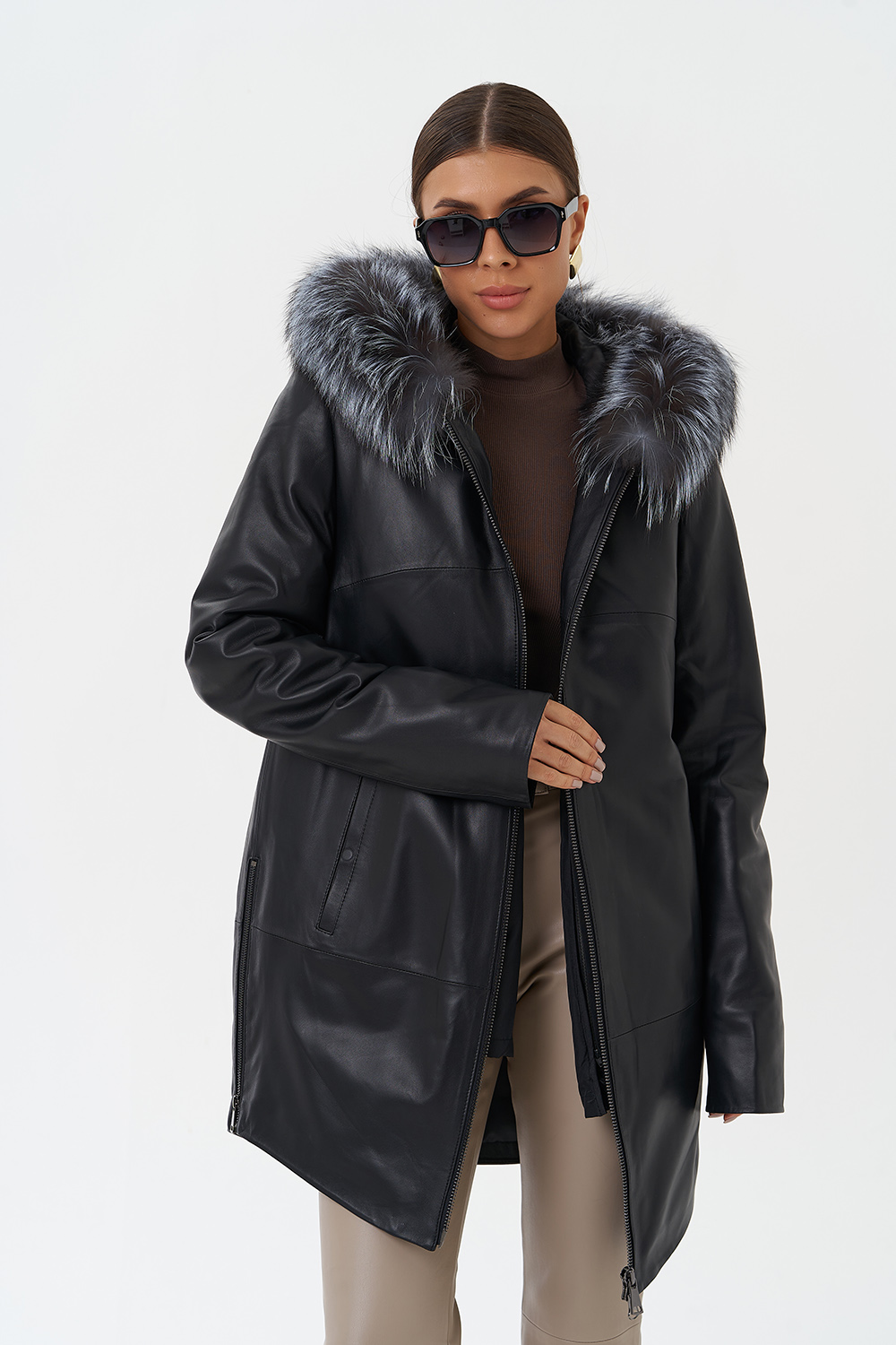 Утепленное пальто из натуральной кожи украсит ваши дождливые будни. Капюшон с отделкой из меха чернобурки согреет в ветреную погоду. Удобный фасон позволит совершать длинные прогулки. Утеплитель обеспечит комфортное пребывание на улице. С помощью молний по бокам изделия вы можете отрегулировать низ модели.